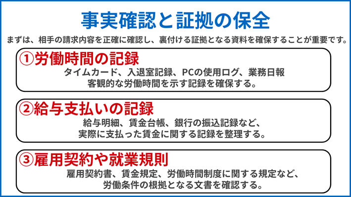 請求書や内容証明郵便が届いたら、まずその請求内容を精査し、社内の労働時間管理の記録など、証拠となる資料を保全します。特に以下の情報について確認が必要です。
